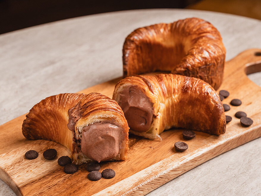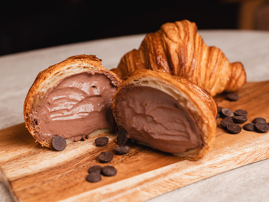 버터의 고소함 위에 발로나 초콜릿 크림을 더해, 달콤하고 부드럽게 완성한 크로와상